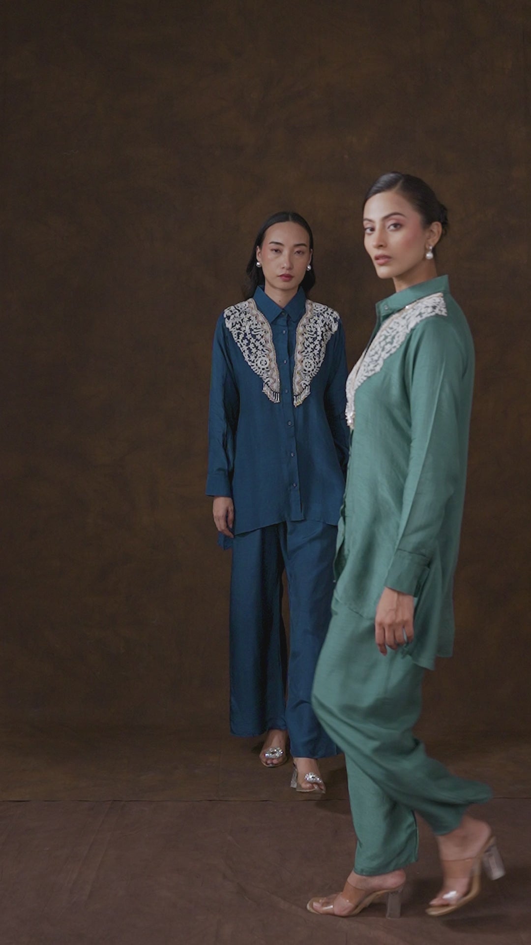 Make a contemporary statement in this sophisticated Ink Blue Set. This two-piece ensemble is crafted from luxurious raw silk, featuring a shirt with a modern, asymmetrical hem. The focal point is the elaborate hand-embroidered yoke, intricately adorned with contrasting threadwork, sequins, and delicate beaded tassels. The look is completed with comfortable, wide-legged pants.