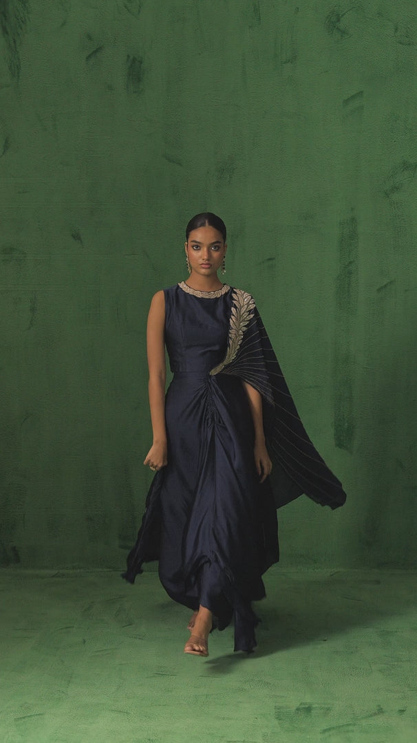 A sophisticated navy satin ensemble featuring a draped skirt, fitted crop top, and an embellished shoulder drape.