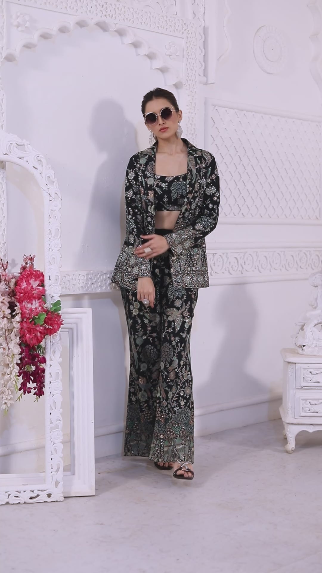 - Comes with a Blazer, crop top and a flowy palazzo pant.