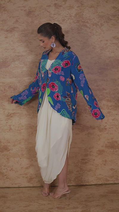 Blue Floral Printed Premium Silk Jacket Draped Gown