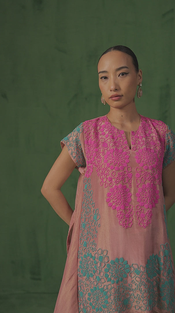 Crafted in soft blush peach shimmer silk, this two-piece ensemble exudes youthful elegance.