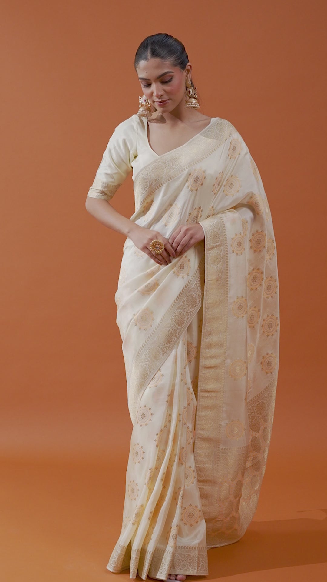 Experience the timeless elegance of this dola silk saree in a beautiful cream color. Its delicate fabric boasts a glistening brocade embroidery that captures and reflects light, adding a touch of enchantment to any occasion. Perfect for upscale weddings, evening receptions, and cocktail parties, this saree comes with a matching blouse and gracefully drapes over your natural curves.
