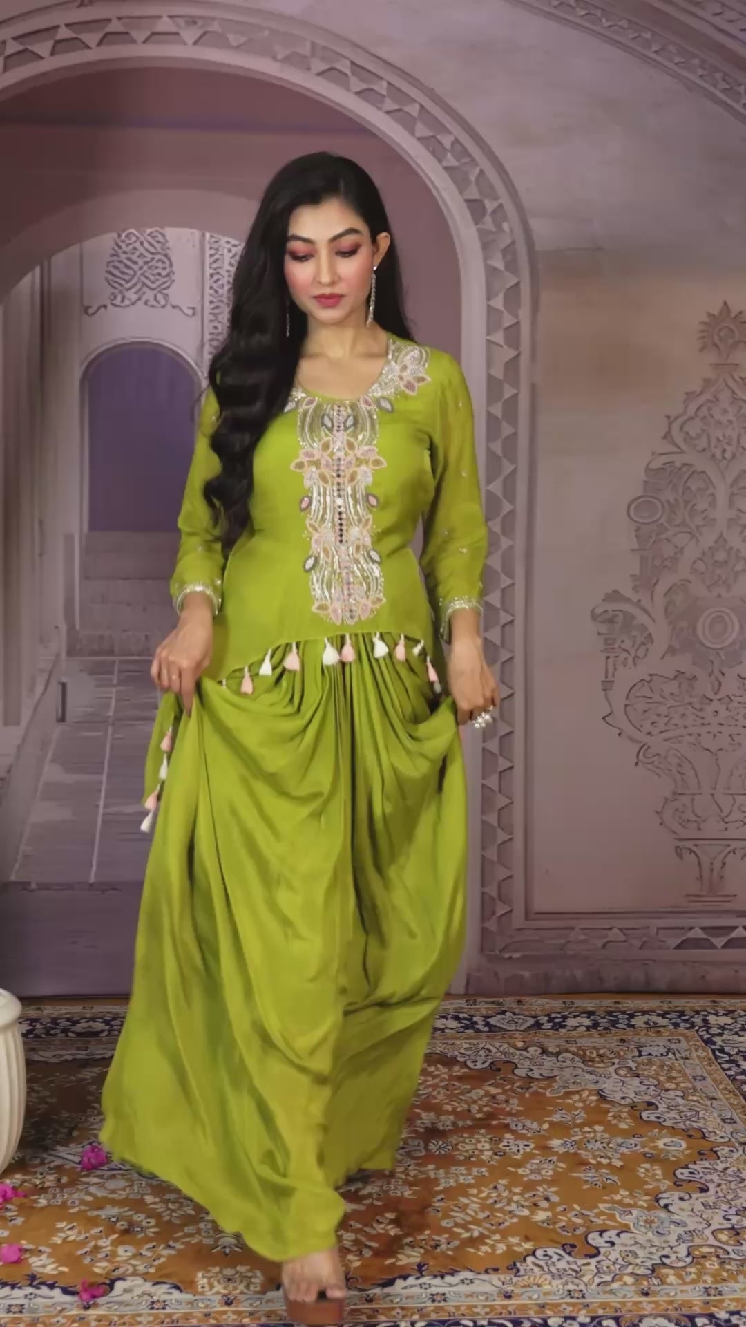 Introducing our Pear Green Embellished Chinon Silk Tunic Dress. This exquisite piece features intricate bead, stone, sequin, cutdana, aari tari, thread, Mirror and tassel handwork on an asymmetrical kurta. The beautifully draped dress adds an elegant touch, making it ideal for special occasions.
