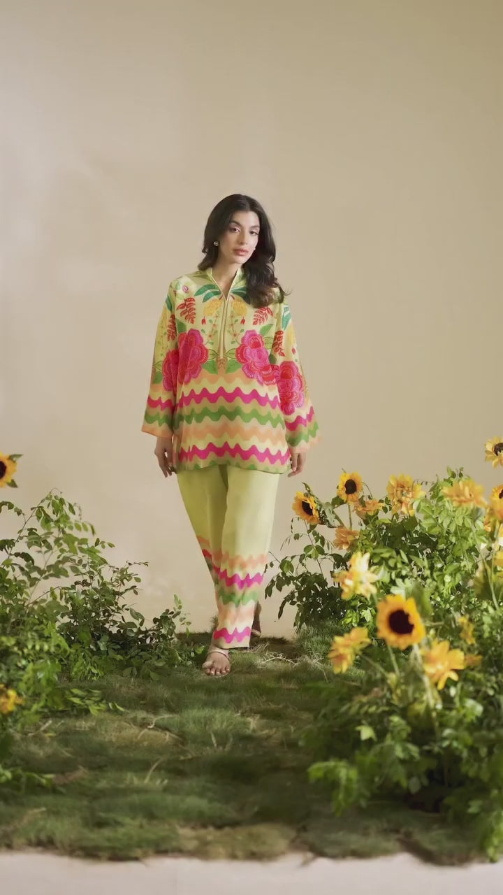 Brighten your wardrobe with this vibrant Multi Color two-piece set, designed to celebrate color and creativity. The kurta features a striking mix of bold floral prints and playful wave patterns in hues of pink, green and orange, finished with a smart notch neckline. The coordinated wide-leg trousers mirror the wavy print at the hem, adding harmony to the ensemble. Crafted from soft, breathable fabric, this outfit offers effortless style and comfort—perfect for casual outings, garden brunches, or day events.