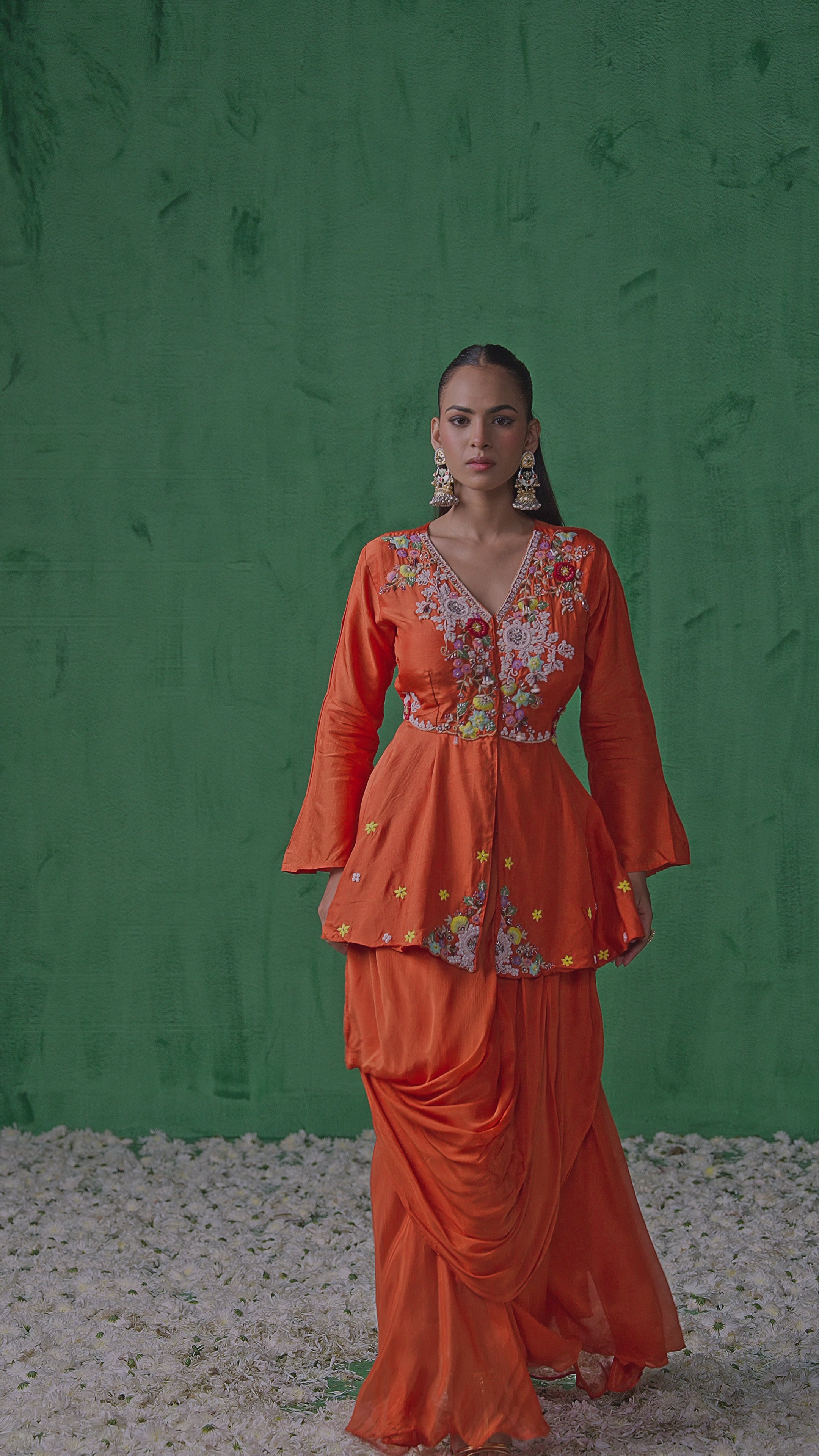 Bright Orange Embellished and Padded Peplum Top With Draped Skirt.