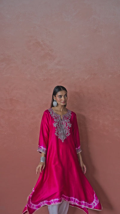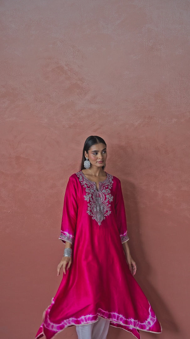 Make a bold statement with this bright pink asymmetrical kurta, crafted in lustrous raw silk. The silhouette features a flowing hemline with a modern asymmetric cut, subtly enhanced by hand-dyed tie-dye detailing along the cuffs and borders.