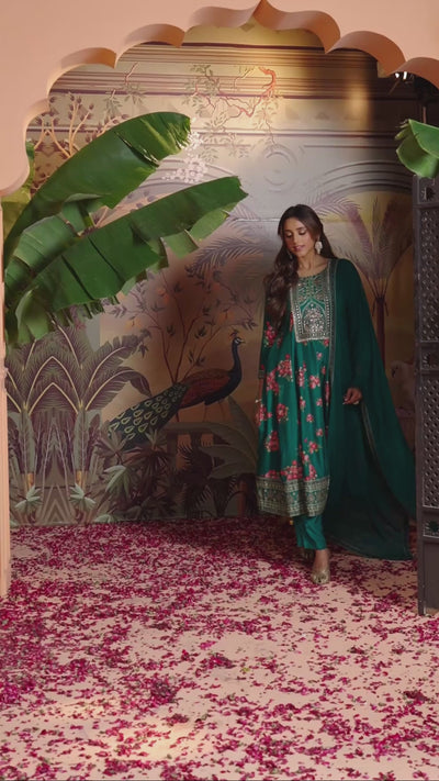 Step into effortless elegance with this Green Embroidered Kurta Set, thoughtfully designed for festive occasions like Poojas, Rituals, and Diwali celebrations. Crafted from luxurious Dola fabric, this three-piece ensemble strikes the perfect balance between traditional charm and modern sophistication. The Anarkali kurta showcases intricate thread and Zari embroidery along the neckline, beautifully accentuated with delicate floral motifs for a timeless, handcrafted touch. Complementing the kurta are matching straight pants, offering a sleek and flattering silhouette. Completing the look is a lightweight Chiffon dupatta, detailed with a subtle border that adds a touch of grace and refinement.