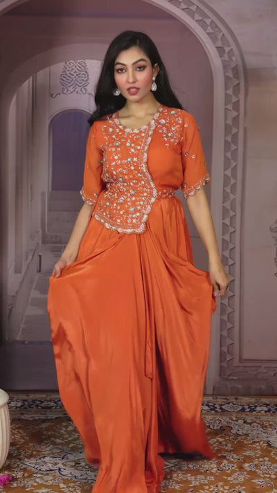 Introducing our Bright Orange Embellished Chinon Silk Drape Gown, featuring exquisite handwork with beads, cut dana, sequins and aari detailing. This beautifully draped gown exudes elegance and sophistication. Perfect for special occasions, it’s a stunning choice for making a lasting impression.