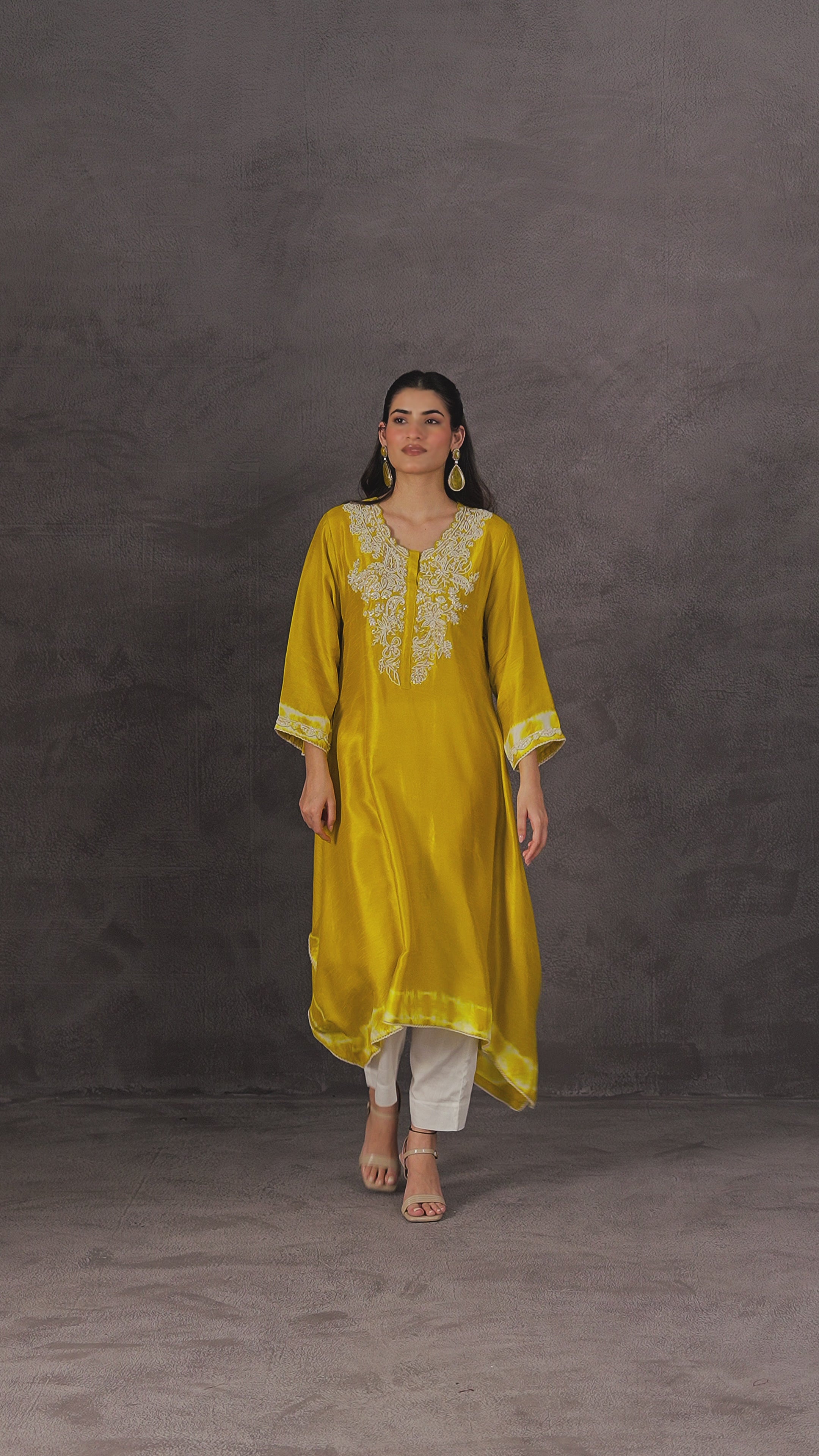 This bright yellow kurta, a perfect blend of traditional elegance and contemporary flair. Crafted from soft raw silk fabric, the kurta features intricate moti (pearl) work delicately hand-embellished work across the neckline and sleeves, adding timeless grace. Bead embellishments further enhance its rich texture, while golden thread work lends a touch of regal sophistication. The garment is beautifully ombre dyed, creating a subtle gradient of yellow tones that adds depth and visual interest. Ideal for festive occasions, haldi functions, or daytime celebrations, this kurta effortlessly captures the essence of refined ethnic style.