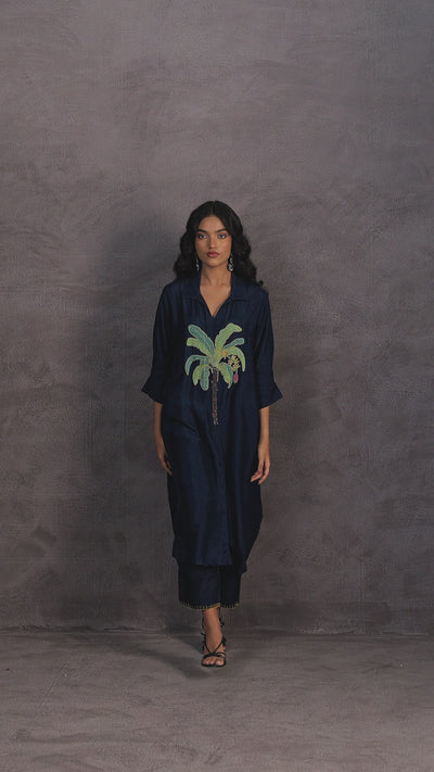 Make a statement in this deep blue raw silk kurta set, featuring intricate bead and cut dana embellishments in a tropical motif. The kurta is paired with a solid crop top and matching pants finished with fine thread embroidery at the hem. A refined blend of artisanal detail and contemporary silhouette, perfect for festive evenings.