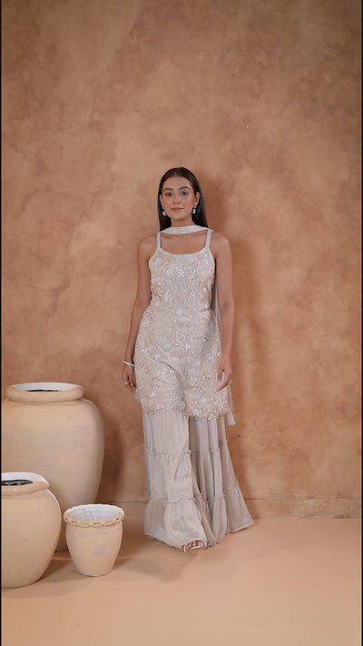 Champagne Beige Embellished Chinon Silk Sharara Set