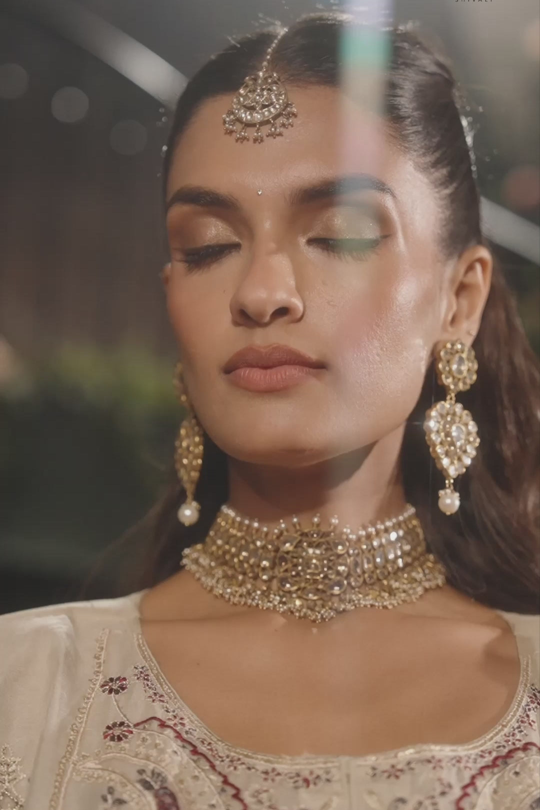 This front-slit long kurta is crafted in a refined champagne-cream tissue, detailed with a precise blend of zari, tonal thread, and sequin embroidery. The design features structured paisley motifs that lead to a dense, ornate border at the hem, complemented by broad embroidered work on the sleeve cuffs. It is paired with straight-cut trousers featuring an embroidered cuff and a sheer dupatta finished with a broad border of zari and threadwork. Lightweight yet visually rich, this set provides a polished and cohesive option for weddings and formal festive gatherings.