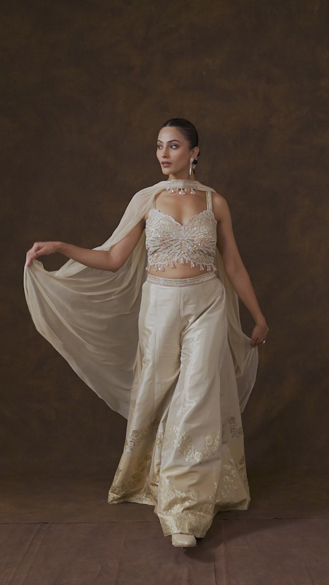 Elegant three-piece Sharara set (blouse, trousers, dupatta).