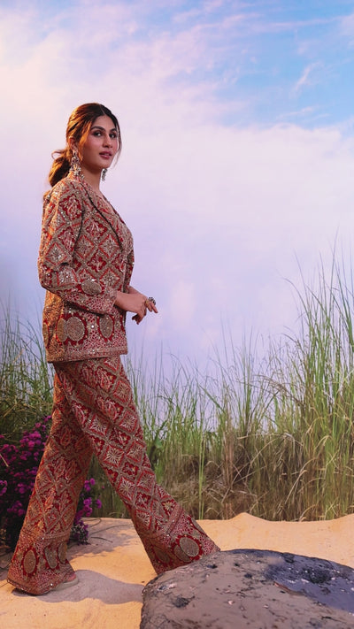 Rich Red Embellished Crepe Silk Palazzo Jacket Set