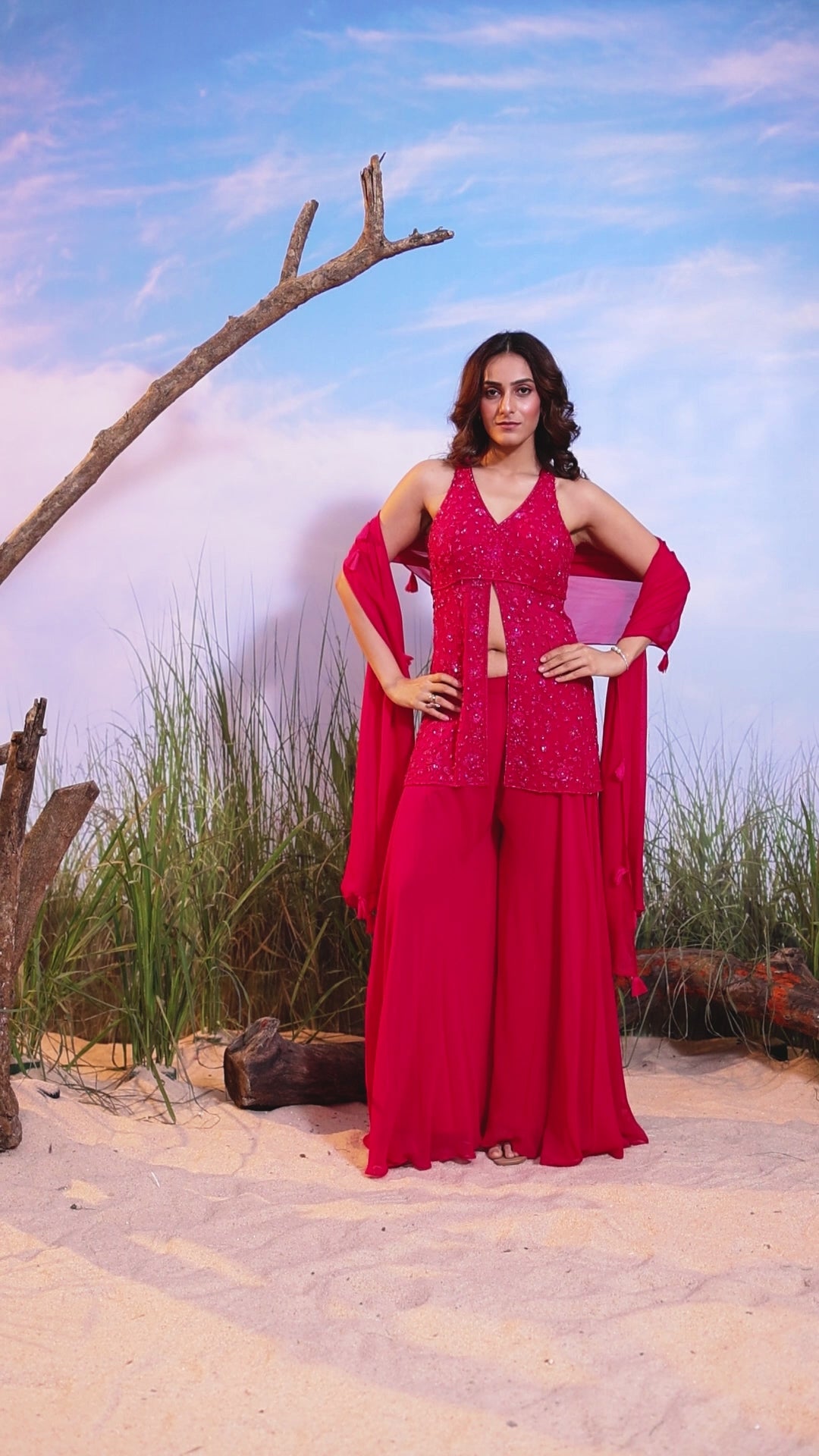 This is a vibrant Red ethnic set featuring a heavily embellished, V-neck slit tunic paired with flowing wide-leg palazzo pants and a matching sheer dupatta.