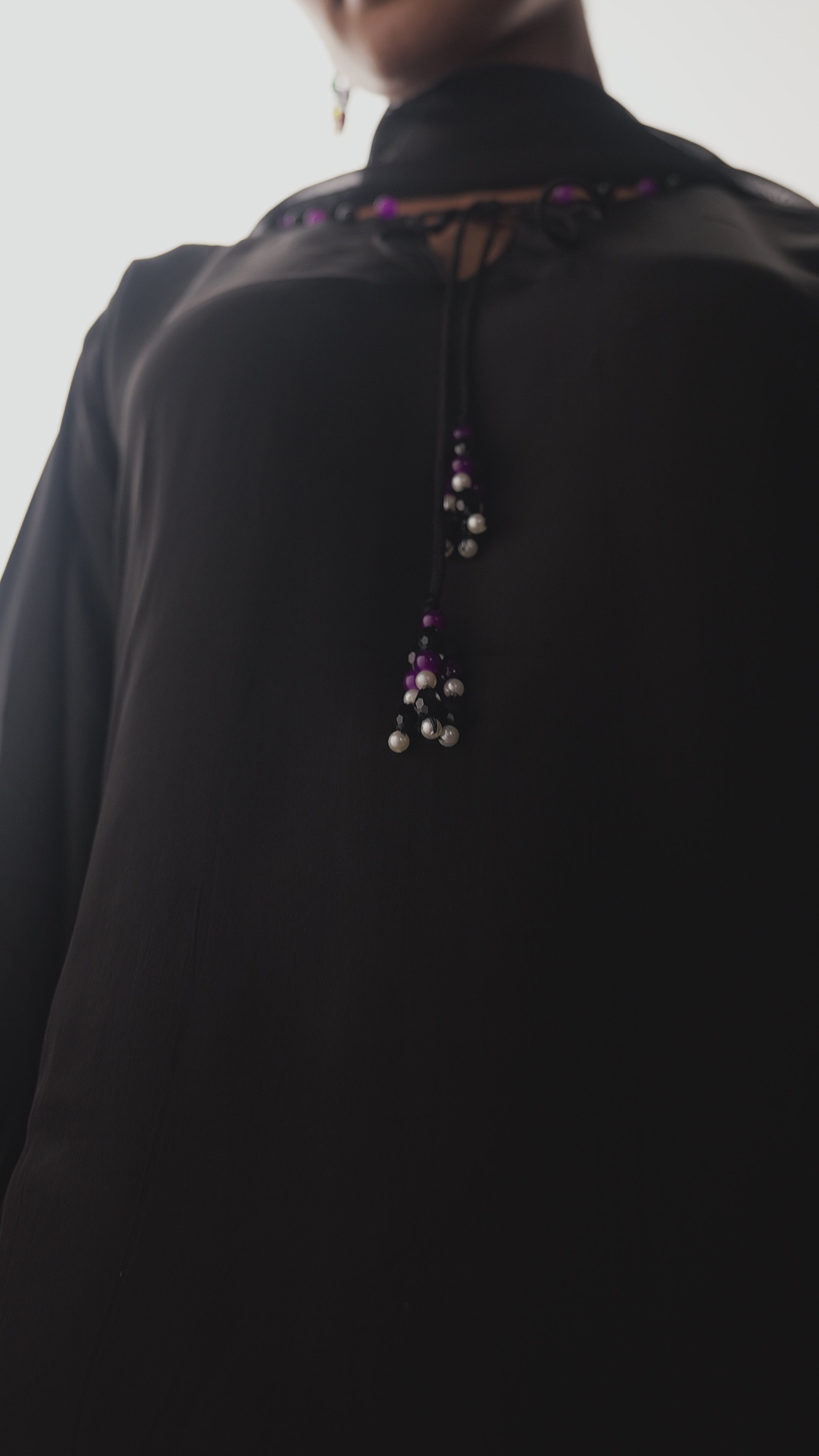 Pearl-accented neckline with tie-up tassels and full sleeves for an elegant finish