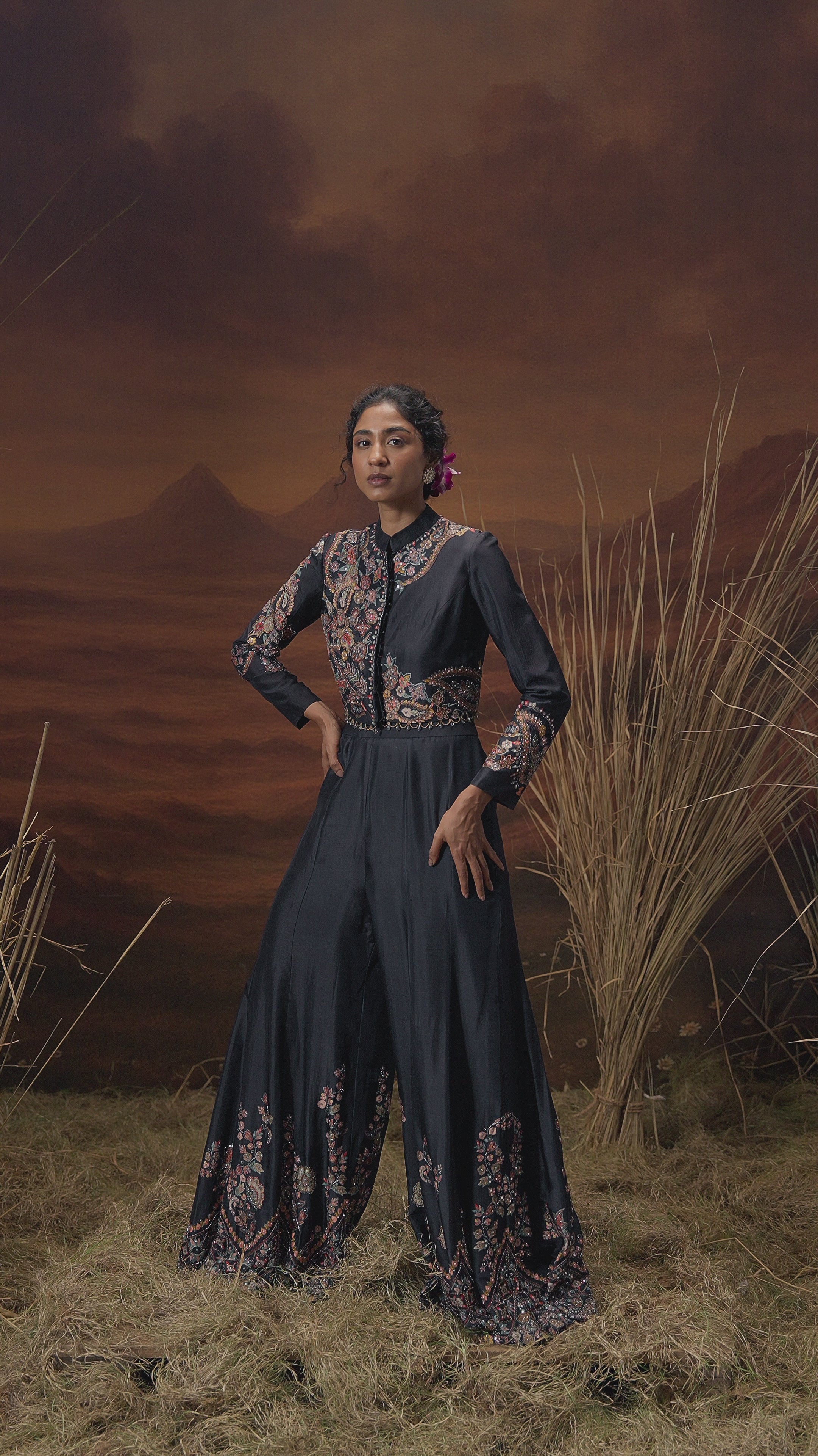 Step into timeless elegance with this Classic Black Embellished Palazzo Set, where every detail speaks of luxury and craftsmanship. The ensemble is elevated with intricate bead, sequins, and hand work — skillfully done by artisans to ensure every piece is unique and rich in detail.
