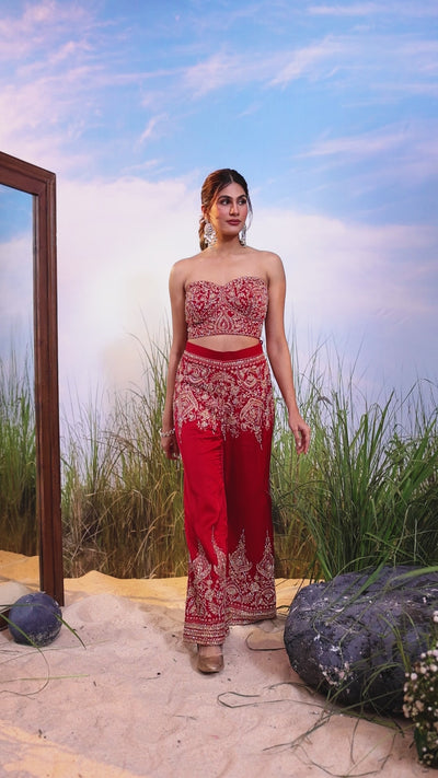 This vibrant Red co-ord set, crafted from elegant Chinon silk, features a flattering tube crop top and wide-leg palazzo pants. The ensemble is richly embellished with intricate Pittan work, golden thread work, and sparkling stones, creating a luxurious and festive statement look.