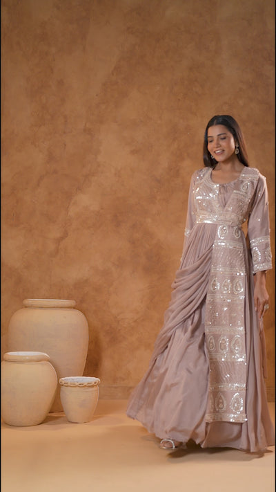 This elegant, pre-draped gown in Dusty Rose features an exquisite bodice and a beautifully draped skirt detail. The gown is heavily embellished, accentuated by an ornate, matching belt and a decorated shawl panel, making it a spectacular choice for a formal or cocktail event.
