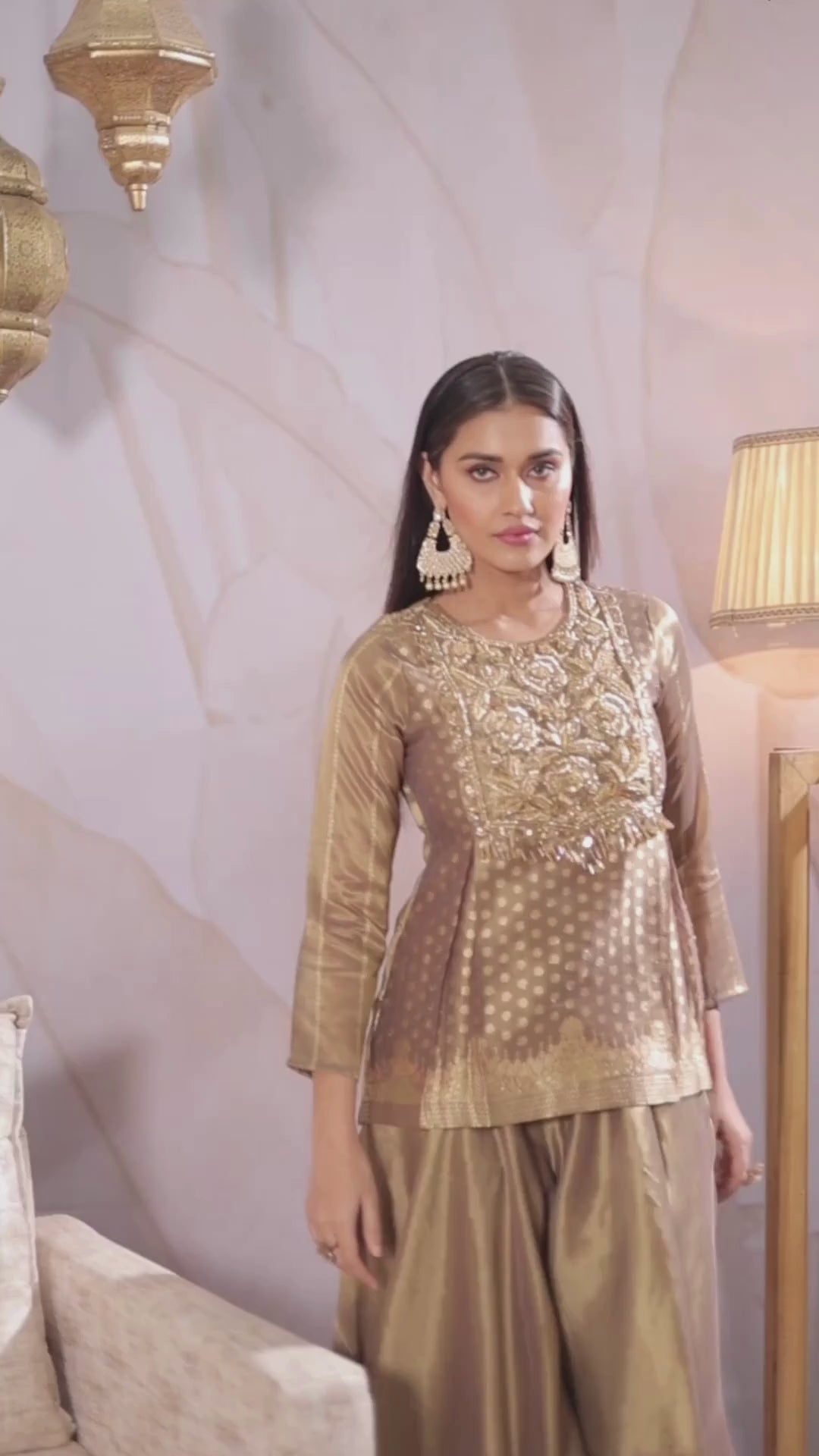 Introducing our Bronze Embellished Premium Brocade Silk Palazzo Set. This elegant ensemble showcases intricate zari, zardosi, sequins, bead and stone handwork on a stylish short kurta. Paired with matching solid flared palazzo. it's perfect for sophisticated occasions. Elevate your wardrobe with this luxurious set.