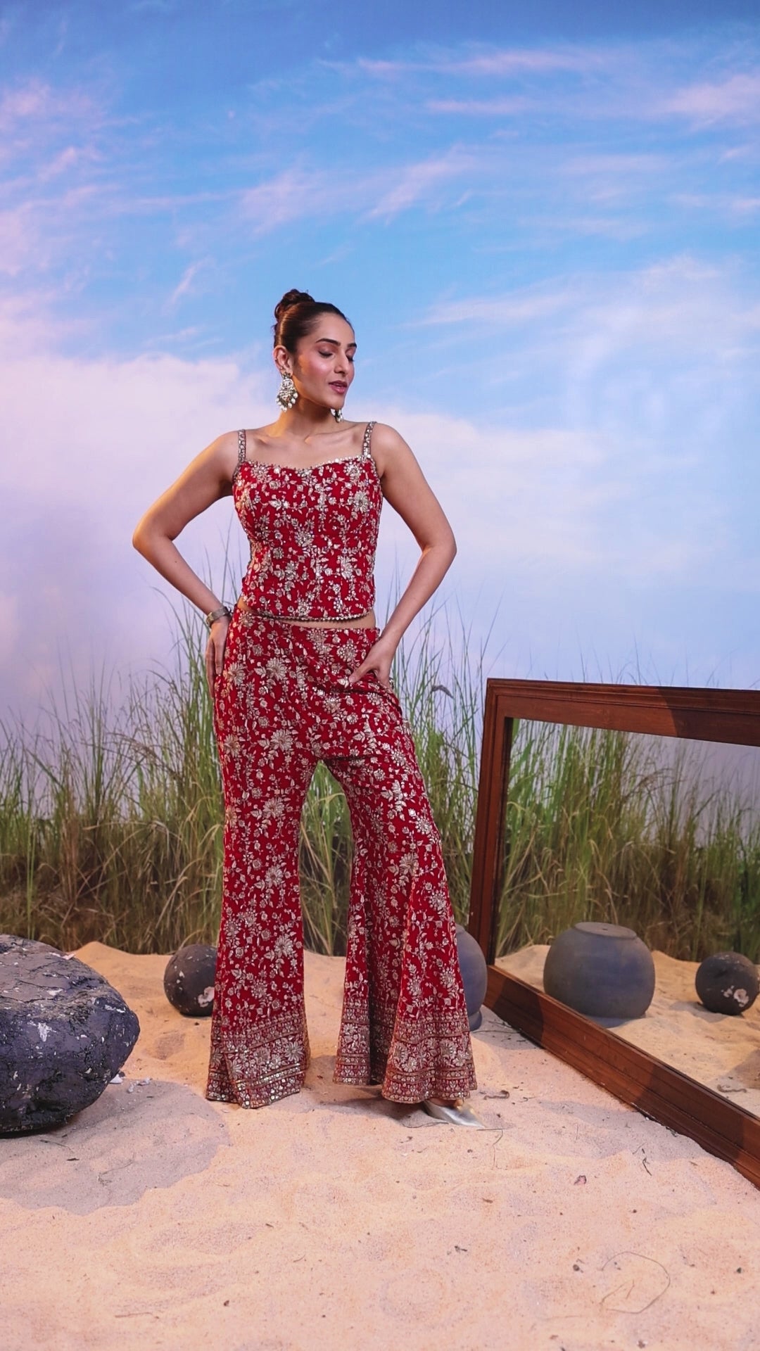 This exquisite outfit showcases a georgette silk top paired with bootcut flare pants, beautifully embellished with all-over sequin work, Mirror, and intricate floral embroidery in gold thread. The detailed craftsmanship and shimmering accents lend it a regal charm, perfect for festive occasions or elegant celebrations.