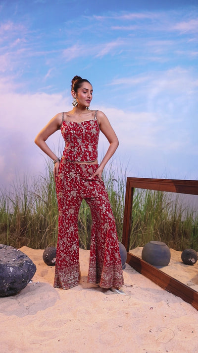 Vivid Red Embellished Georgette Silk Co-Ord Set