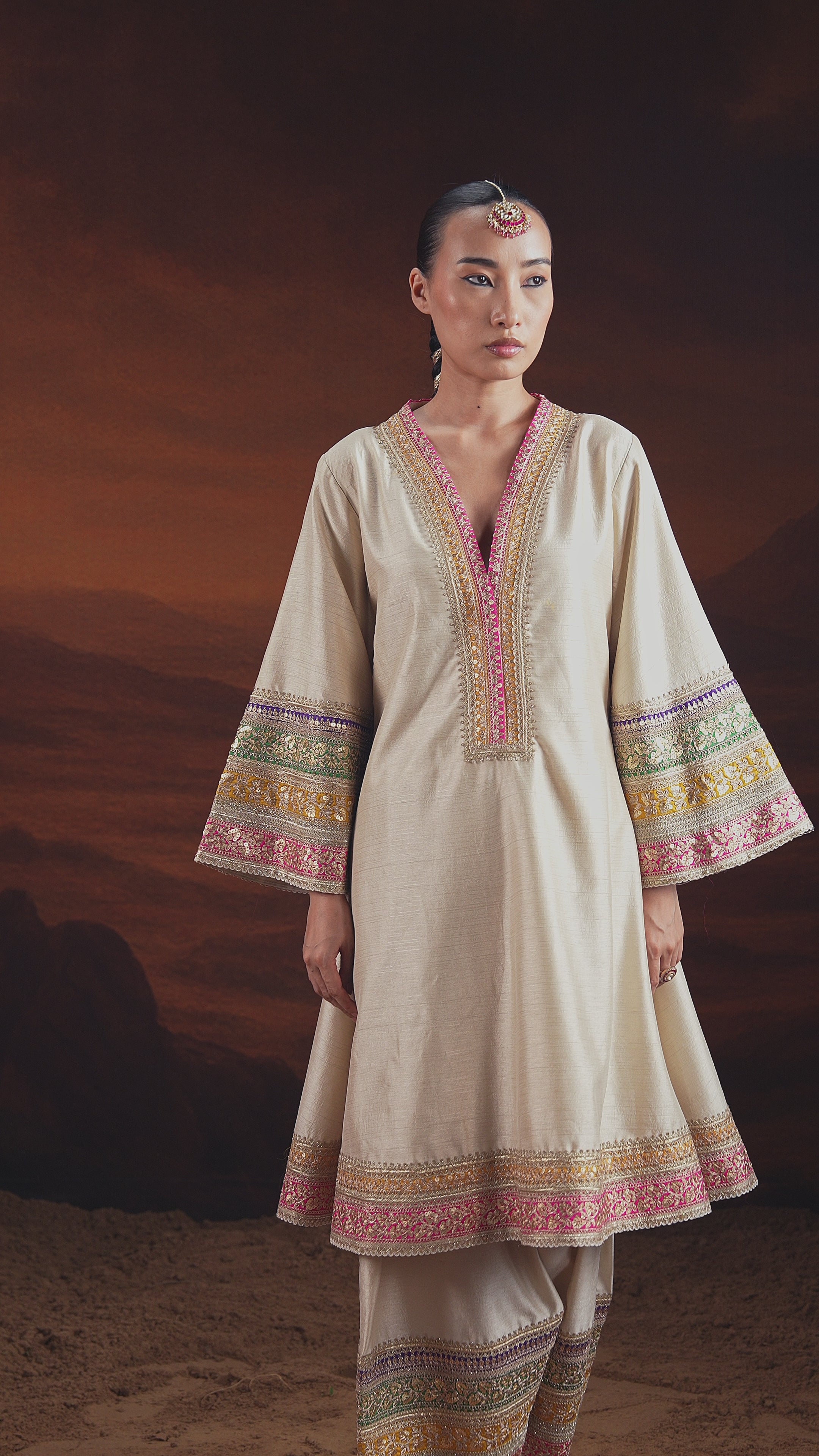 This elegant three-piece set features a kurta, wide-leg palazzo, and a dupatta, all in a soft beige color.