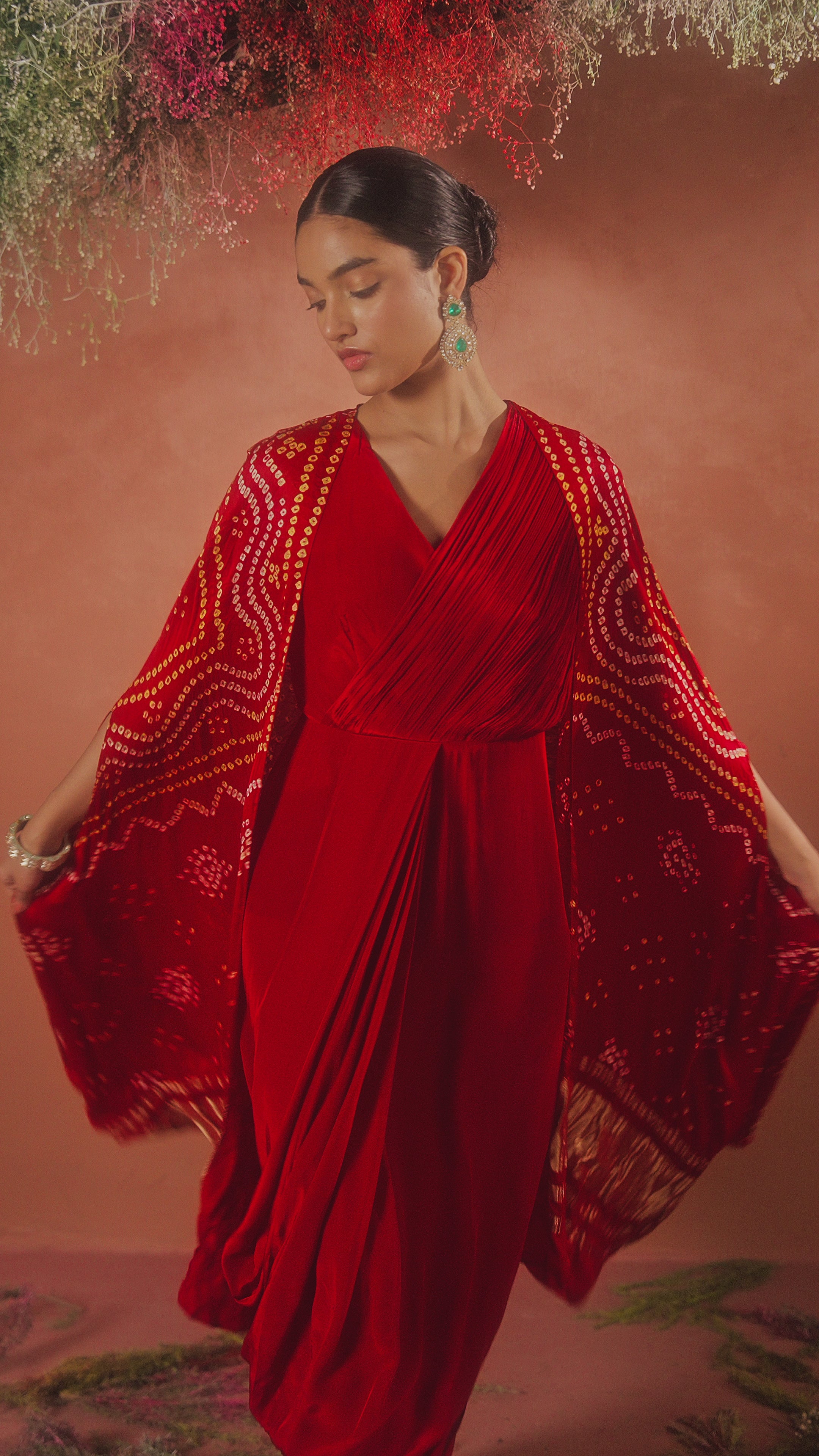 This elegant ensemble features a satin silk drape gown with a flattering pleated waist belt, creating a structured yet fluid silhouette. The gown is paired with a beautifully crafted bandhani-style cape, intricately embellished with sequins, Zari, and beadwork. The luxurious fabric and intricate detailing make it perfect for festive and formal occasions.