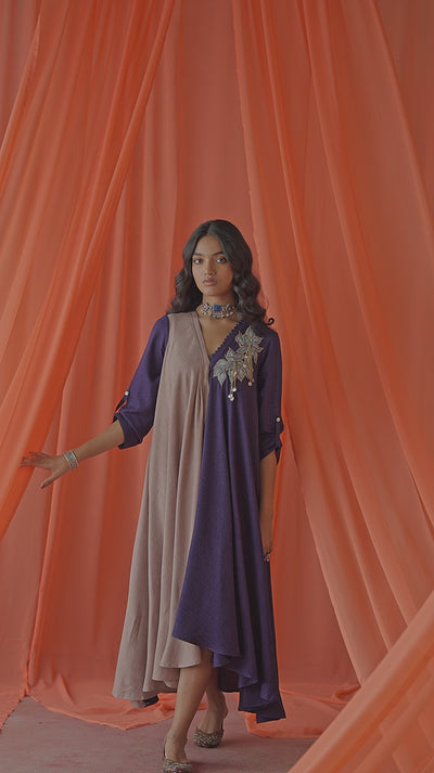 Step into effortless elegance with this flowing dress, where fluid draping meets artful detail in a play of soft contrast and refined embellishment.