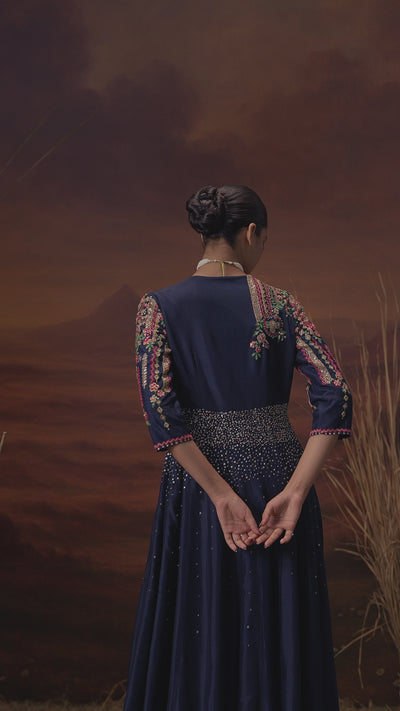 Grace any celebration with this majestic Navy Blue Raw Silk Kurta and Palazzo Set, featuring a mesmerizing fusion of intricate floral motifs and sparkling embellishments. This outfit has a stylish front-cut design for a contemporary look.