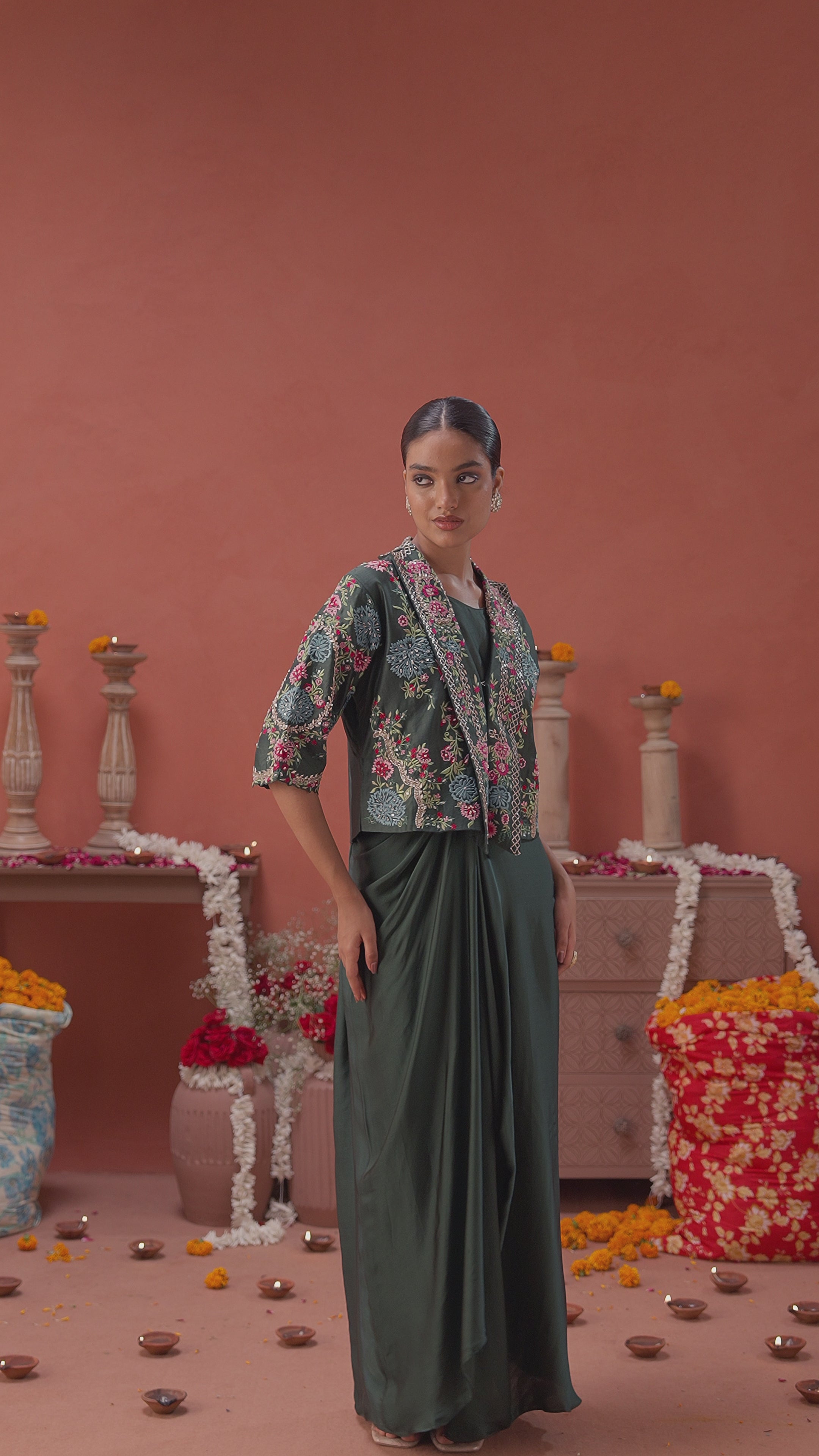 Dark Green Embellished Satin Silk Drape Skirt With Jacket