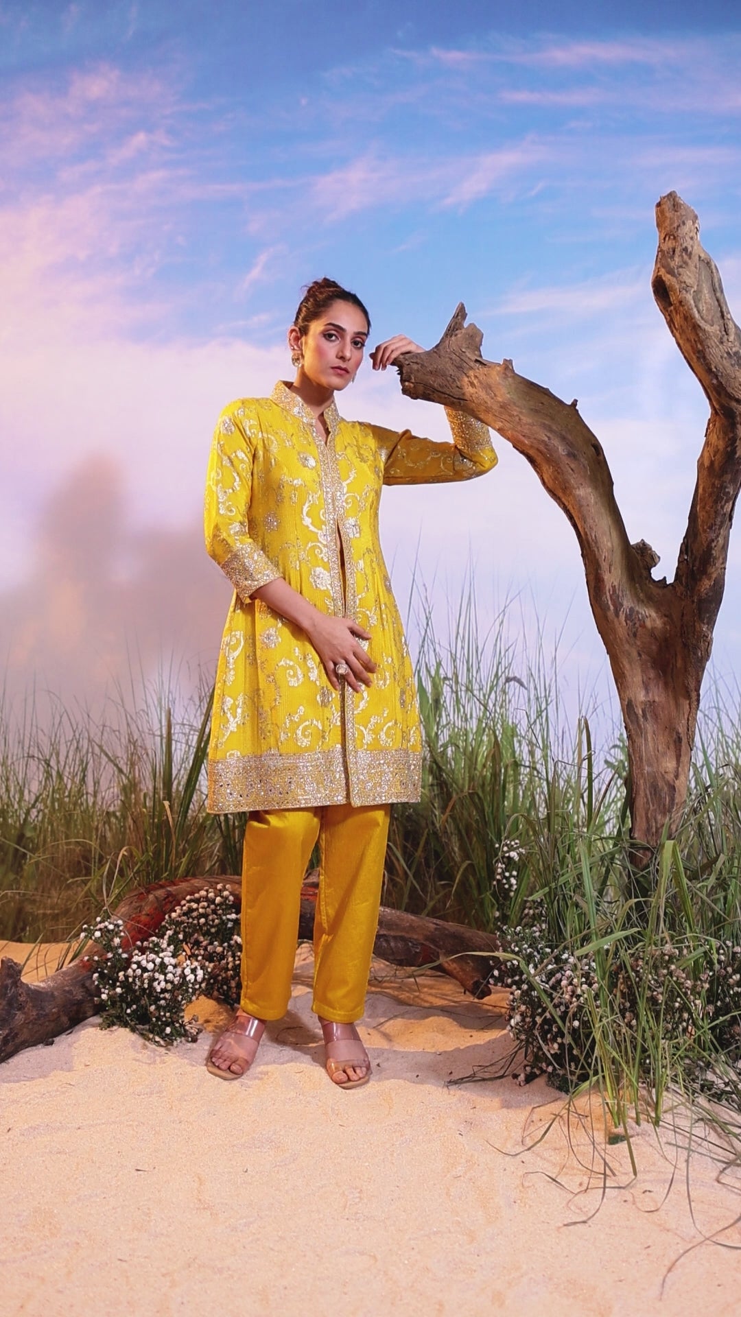 A stunning Mustard Yellow brocade silk kurta featuring a front slit and elaborate traditional work including mirror work, beads, cut dana, and stones, paired with matching tailored pants. This outfit is a perfect fusion of regal fabric with heavy festive embellishments.