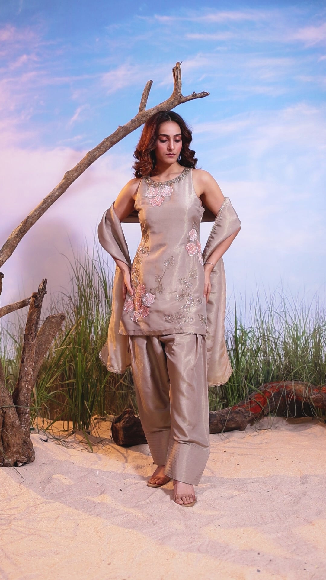 Muted Beige Embellished Shimmer Tissue Silk Pant Set