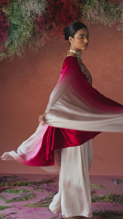 Elevate your festive wardrobe with our Dark Pink Embellished Satin Silk Kaftan Set — a perfect blend of elegance and comfort. Crafted in luxurious satin silk, this kaftan features an ombre transition from rich emerald green to a soft beige hue, exuding effortless grace The neckline is adorned with intricate hand embroidery, highlighted by zari work, sequins, and delicate bead embellishments that add a regal charm. The flowy silhouette ensures a flattering drape, while the lightweight fabric offers ease of movement — ideal for festive celebrations.