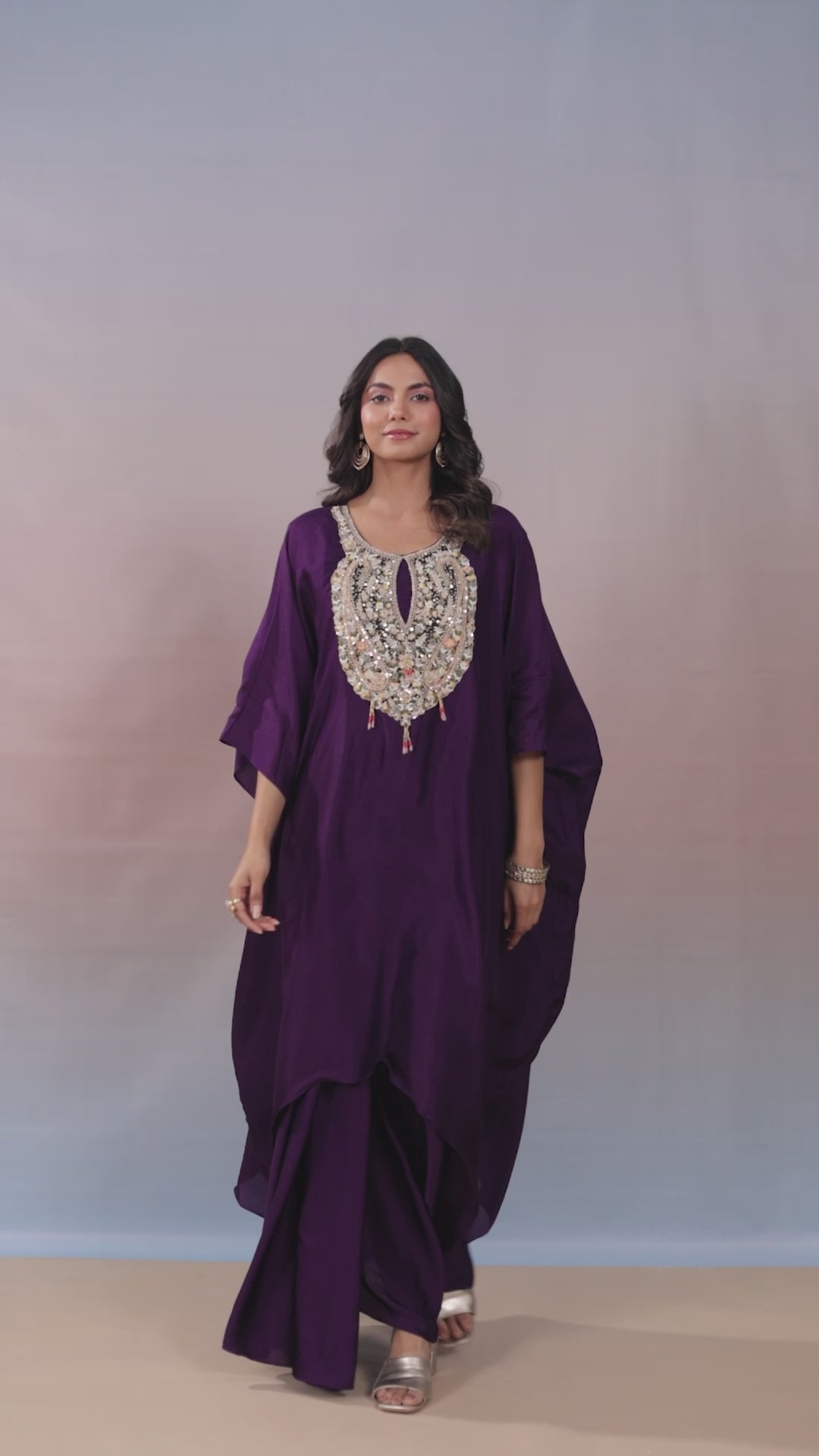 Dark purple embroidered premium silk asymmetrical kaftan. Crafted with intrinsic sequin, zari, beads and thread handwork embroidery. Paired with matching solid draped skirt. Apt for semi formal wear.