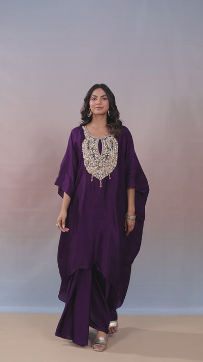 Dark Purple Embroidered Premium Silk Kaftan & Skirt Set
