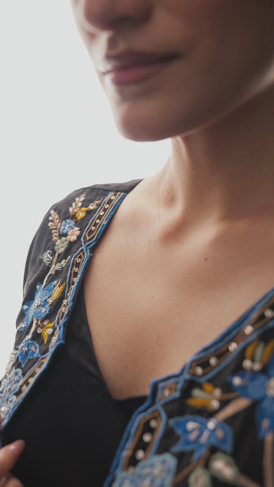 The outfit features a beautifully embellished black cape with intricate floral embroidery, showcasing an elegant mix of colors and textures that give it a timeless, sophisticated appeal. The cape exudes a luxurious vibe, drawing attention to the exquisite detailing and fine handwork Paired with this eye-catching piece is a sleek black crop top, maintaining a simple and chic silhouette, which balances the richness of the cape. The fluid black georgette silk skirt adds an element of graceful movement, its pleats flowing seamlessly with every step. This combination creates a silhouette that's both dramatic and refined.