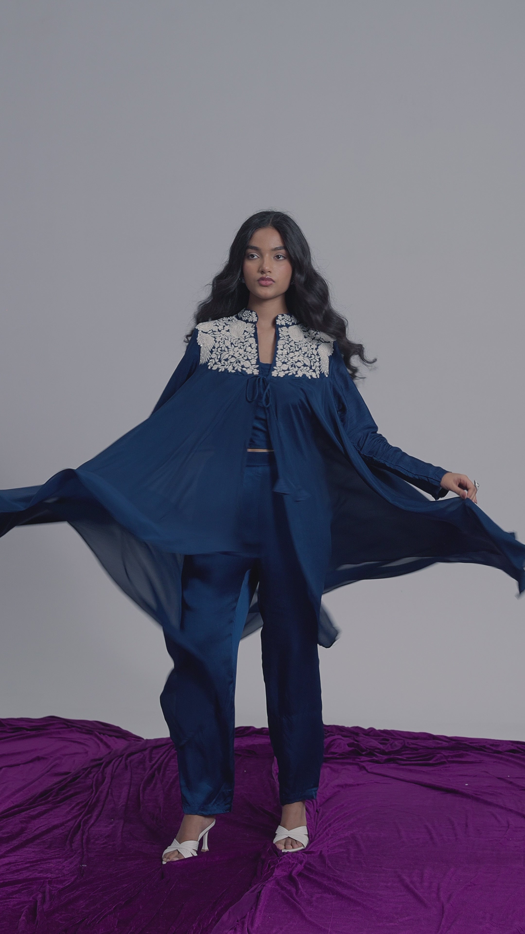 Deep Blue Embroidered Chinon Silk Co-Ord Set