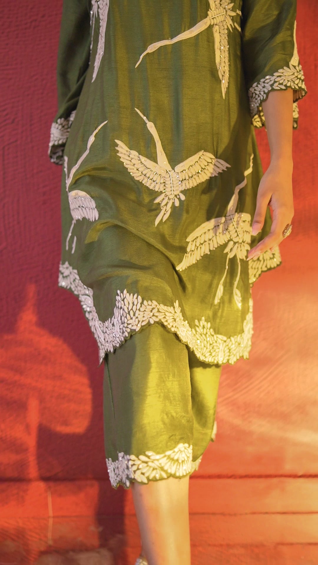 Forest Green Flamingo Embroidered Raw Silk Co-Ord Set