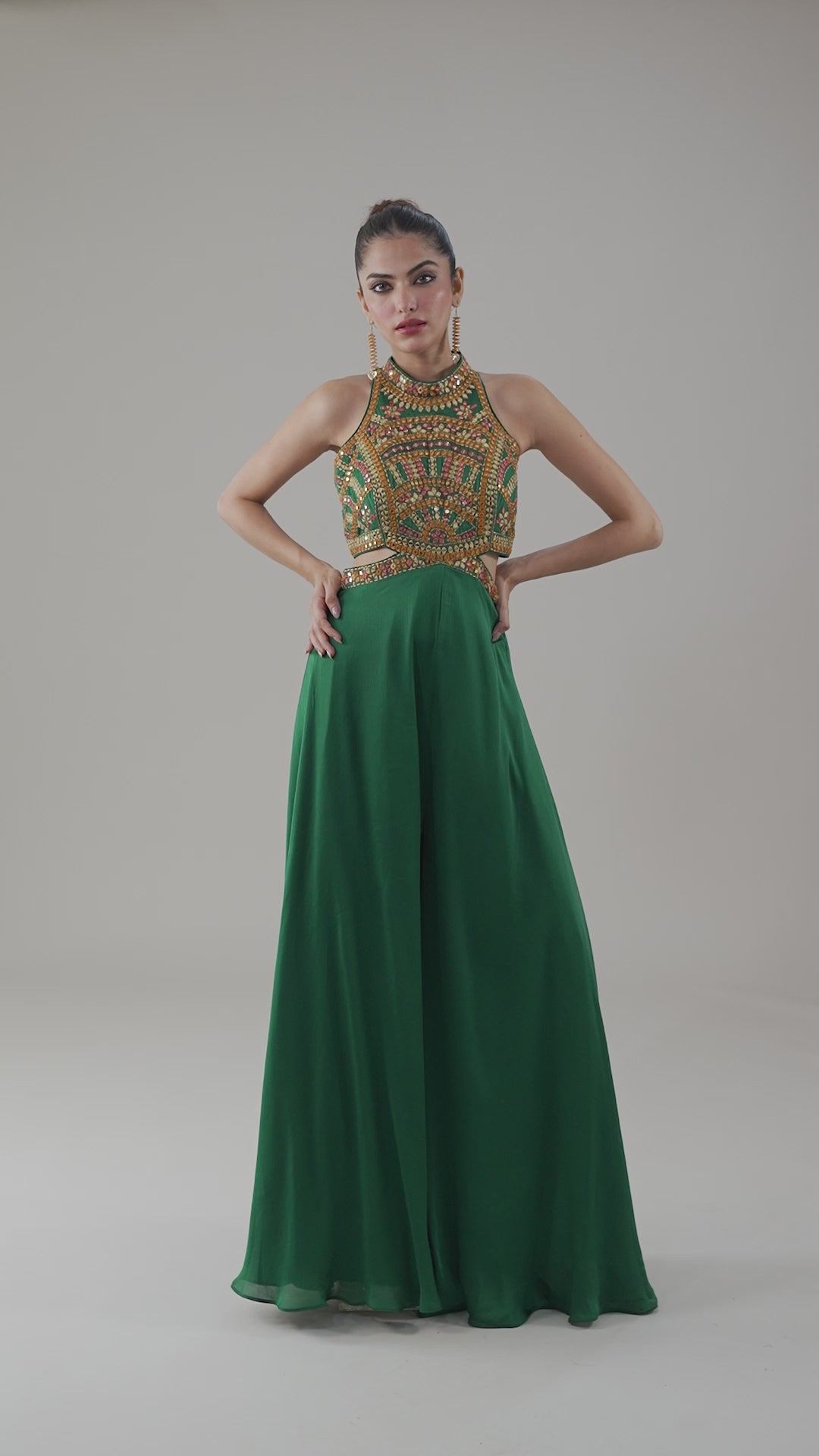 Introducing our Deep Green Embroidered Chinon Satin Silk Jumpsuit, a perfect blend of elegance and modern sophistication. Crafted with intricate mirror handwork, this jumpsuit exudes luxury and timeless appeal. Featuring a padded halter neckline, it offers a flattering silhouette and comfortable fit, making it ideal for semi-formal occasions.