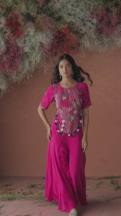 A striking premium silk crop top and palazzo set in vibrant Deep Pink, adorned with intricate handwork. The top features bead, cut dana, sequin, mirror, and thread embroidery, elevated with decorative coins and playful thread hangings. Tassels at the back add a festive touch. A bold and beautiful ensemble perfect for statement celebrations.