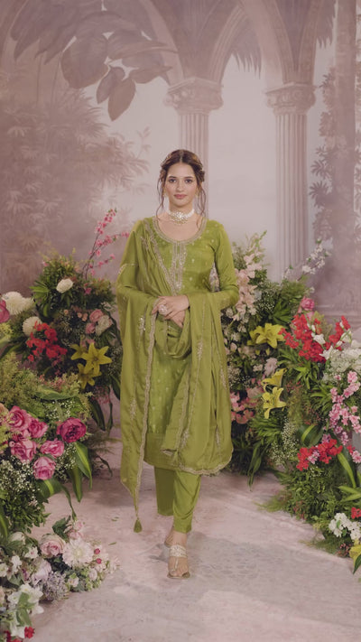 Radiate elegance in this exquisite olive green embroidered Pant set, a perfect fusion of classic design and refined craftsmanship. The straight-fit kurta is adorned with delicate golden embroidery and sequin detailing, featuring a richly decorated neckline and hemline for a regal finish. The matching pants and dupatta, enhanced with intricate border work and scalloped edges, add to the outfit’s luxurious appeal. Ideal for festive events, cultural celebrations, or formal gatherings, this ensemble offers timeless grace with a contemporary touch.