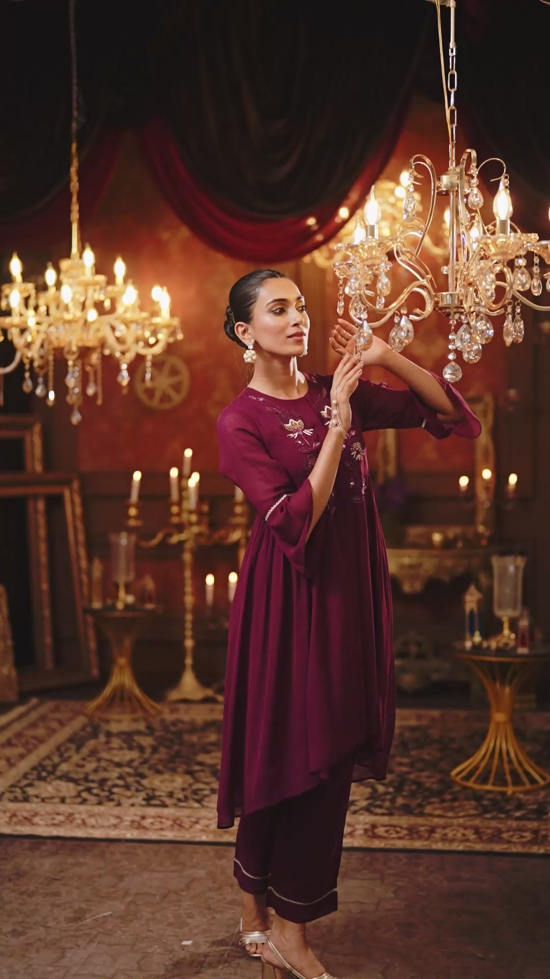Work: Detailed hand-embroidery featuring floral and vine motifs using beads, sequins, zari and pearls on the front yoke. Subtle contrast detailing on the pant hem.