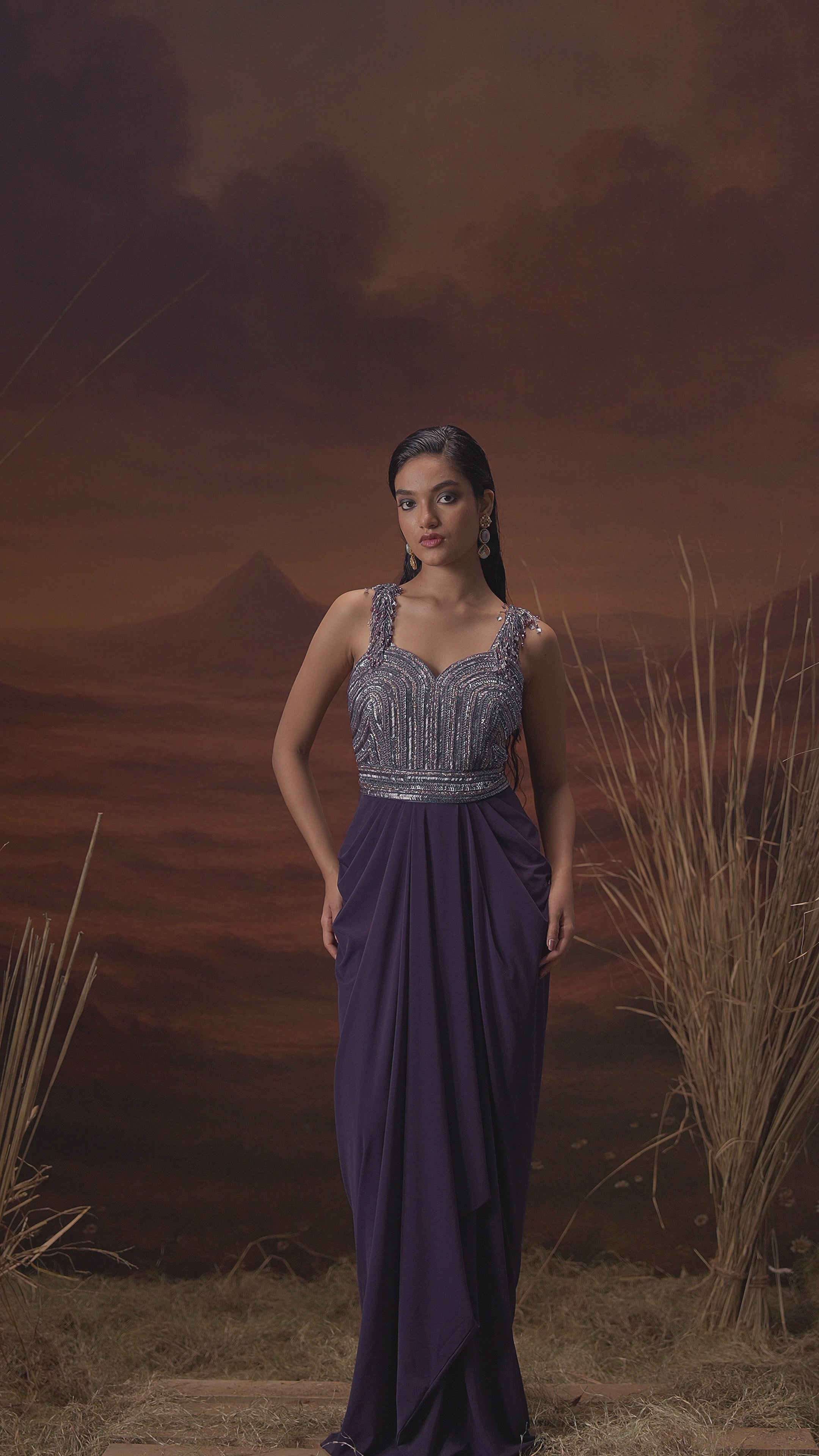 This beautiful gown, crafted from a comfortable spandex lycra fabric, offers a sleek and form-fitting silhouette. The upper bodice is lavishly embellished with a mix of cut dhana, sequins, and beads, creating a dazzling and textured effect. The rich, deep plum color of the dress, combined with the intricate handwork, makes this a perfect choice for a glamorous evening event.