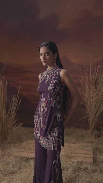 It is a deep wine colored short tunic (kurti) and flared palazzo pants set.