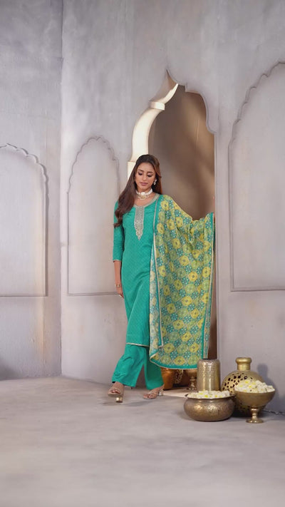 A teal kurta-and-pant set paired with a yellow and teal printed dupatta.