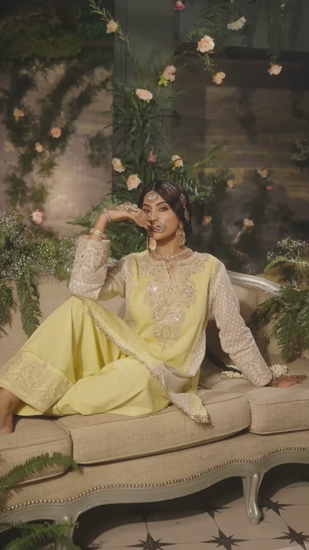This vibrant lemon yellow ensemble features a contemporary patiala suit silhouette, showcasing a panelled short kurta paired with voluminous salwar pants. The outfit is opulently detailed with heavy gold thread embroidery, shimmering sequins, and intricate mirror-work concentrated along the neckline and wide ankle cuffs. While the main body is crafted from raw silk, it features contrasting white cotton sleeves with delicate self-textured patterns, completed by a coordinating dupatta for a regal festive look.