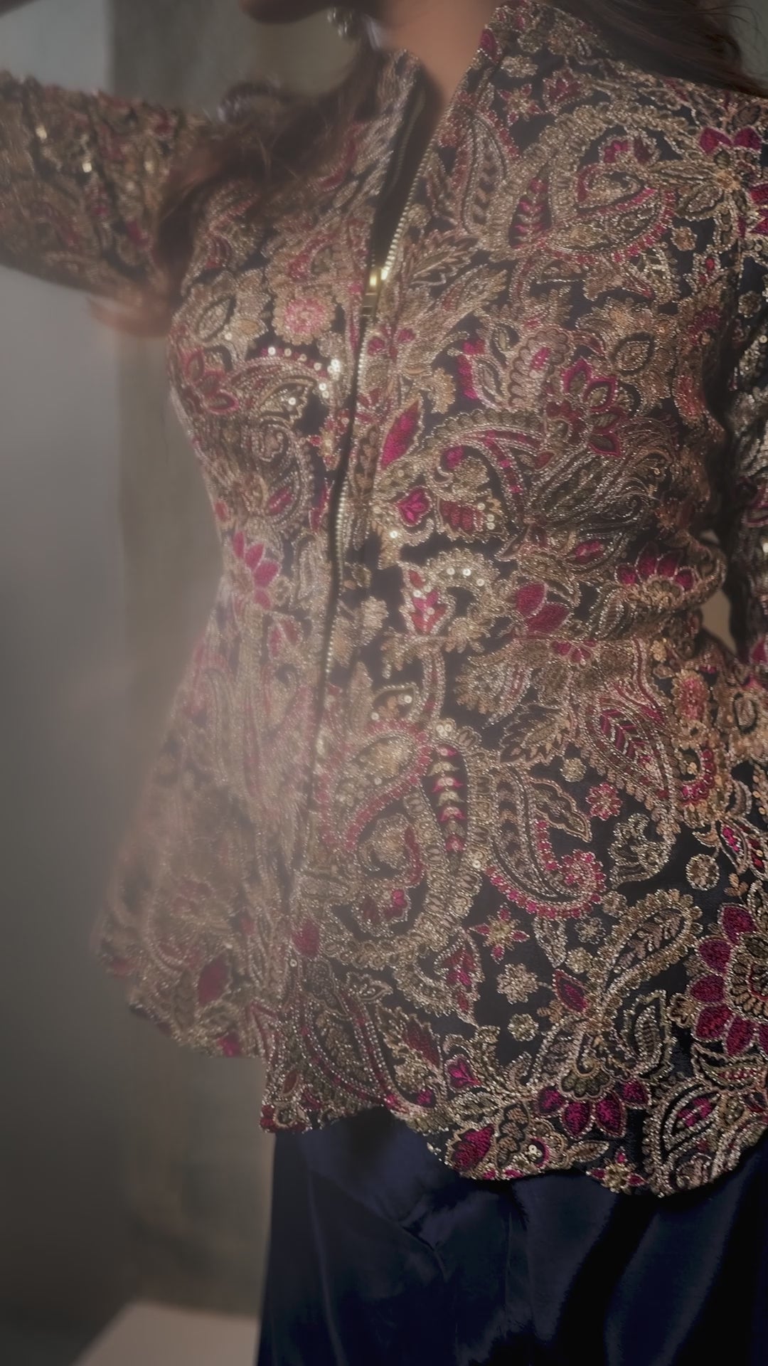 Contrasting the flowing, solid purple palazzo pants, the fitted peplum top is a masterpiece of craftsmanship, with intricate golden zari outlining the detailed, colorful beads and sequin floral embroidery.
