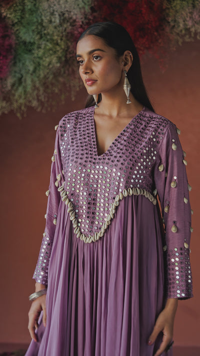 A flowy georgette gown in a soft dusty lavender, highlighted with intricate mirror work and hand-embellished sea shells. The V-neck yoke and full sleeves add a regal touch to the silhouette. Perfect for festive occasions and elegant soirées.