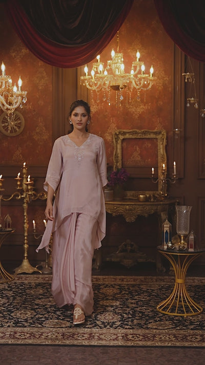 Exude understated glamour in this exquisite two-piece set, crafted from flowy Chinon Silk. It features a modern asymmetric kurta with elegant hand-work on the neckline, perfectly paired with a fashion-forward, draped skirt.